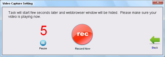 4. Setting window will switch to new frame (see below). You have two ways to start your capture task: (1) "Play/resume" your video and click "Record Now " button. (2) Wait the countdown timer, "Play/resume" your video just before the timer is finished. "Special Attention": You must "play/resume" your video before countdown timer is finished or clicking "Record Now" button. |